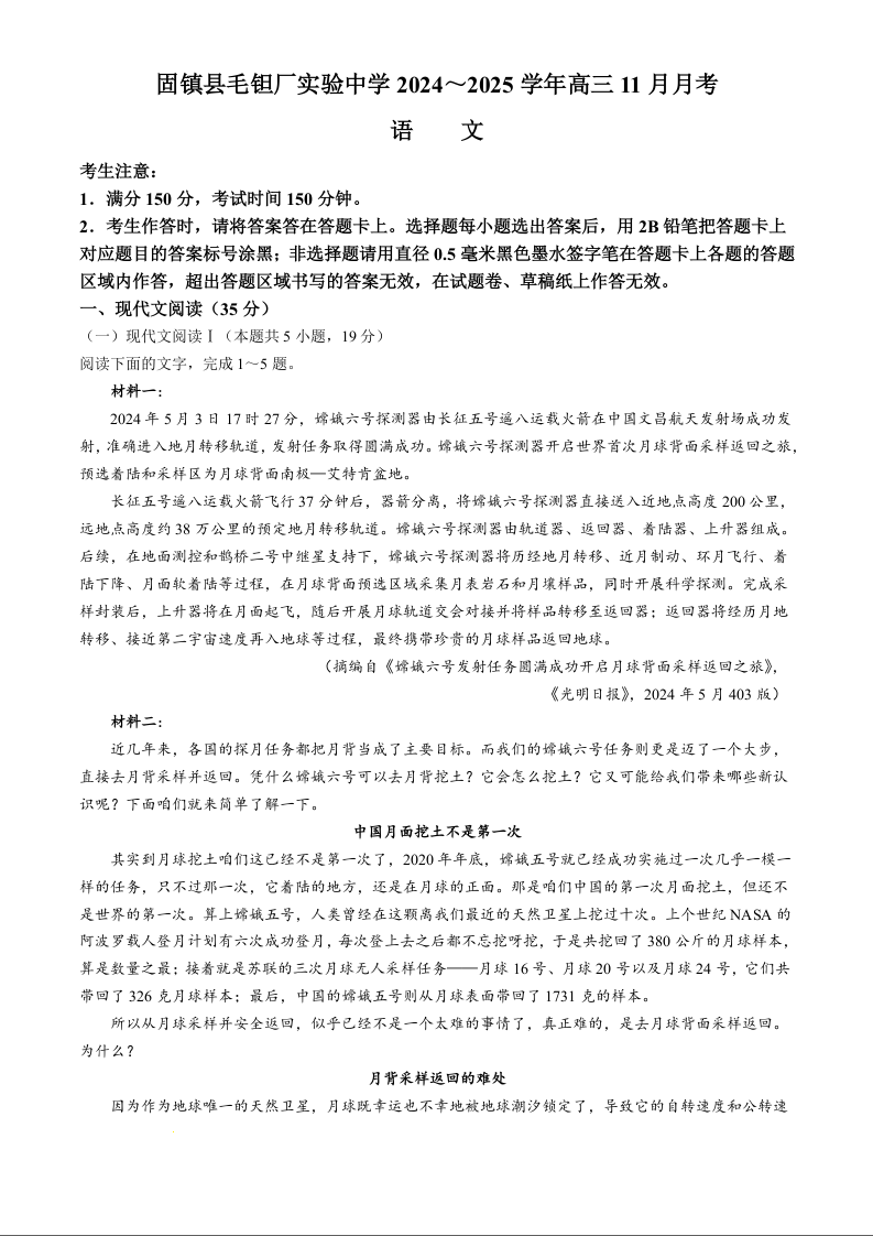 安徽省毛坦厂实验中学2025届高三11月期中考试语文+答案