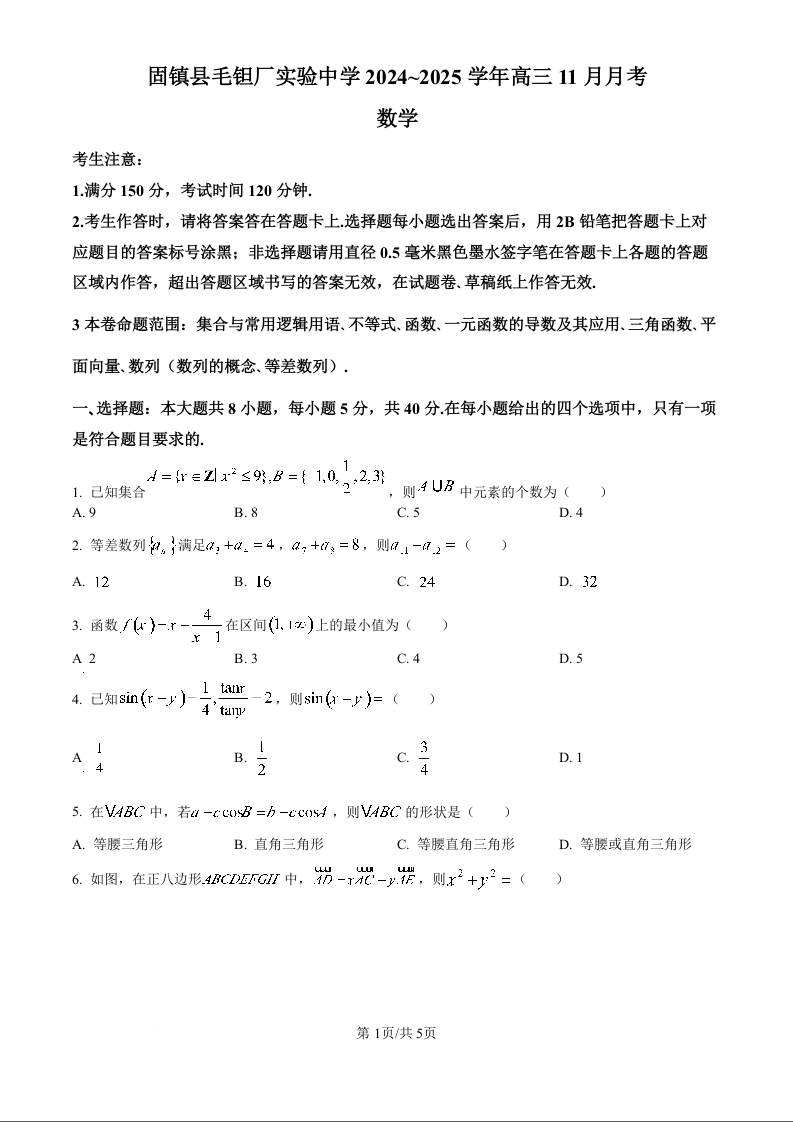 安徽省毛坦厂实验中学2025届高三11月期中考试数学