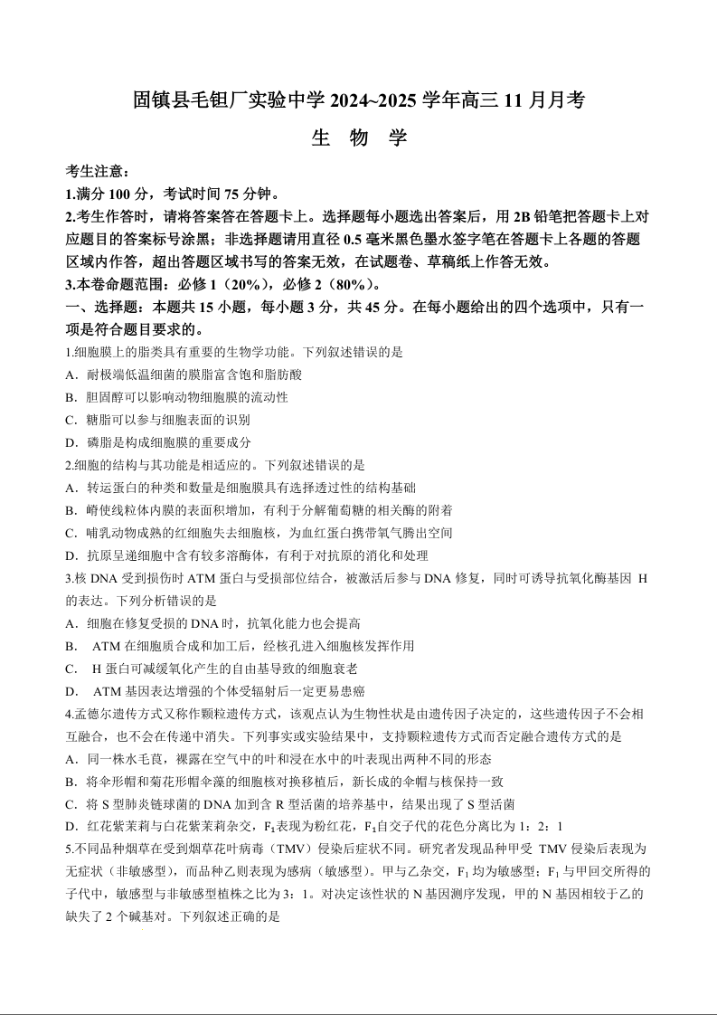 安徽省毛坦厂实验中学2025届高三11月期中考试生物+答案