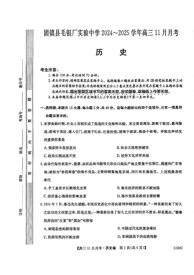 安徽省毛坦厂实验中学2025届高三11月期中考试历史
