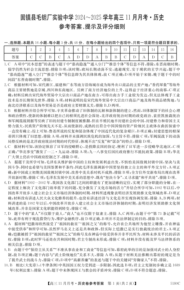 安徽省毛坦厂实验中学2025届高三11月期中考试历史答案