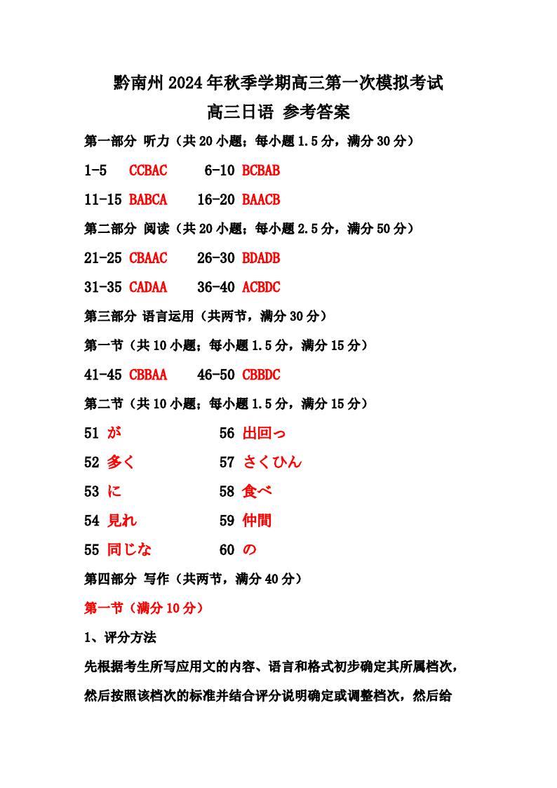 贵州省黔南州2025届高三年级第一次模拟考试日语答案