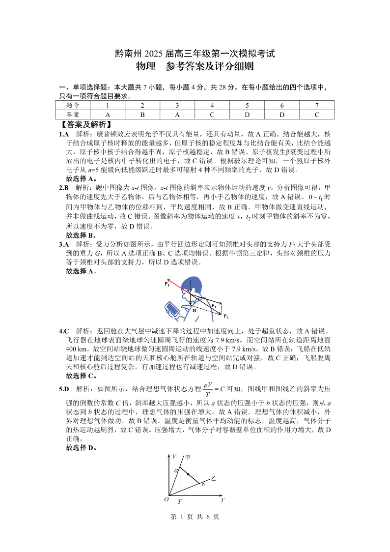 贵州省黔南州2025届高三年级第一次模拟考试物理答案