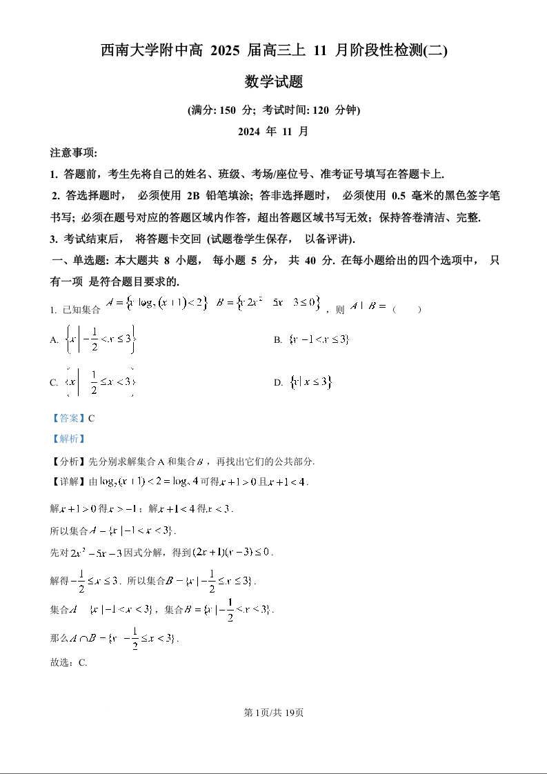 重庆市西南大学附属中学2025届高三上学期11月阶段性检测(二)数学(精品解析版)