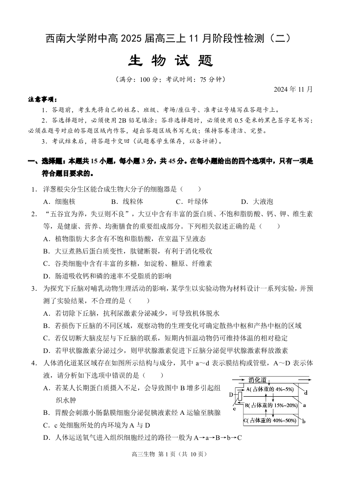 重庆市西南大学附属中学2025届高三上学期11月阶段性检测(二)生物
