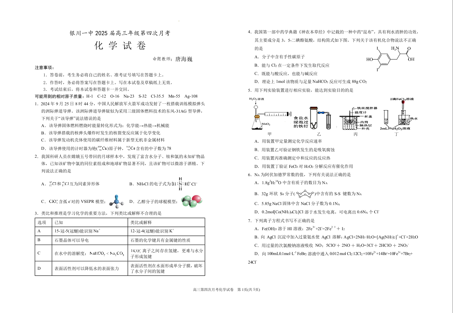 宁夏回族自治区银川一中2025届高三上学期第四次月考化学