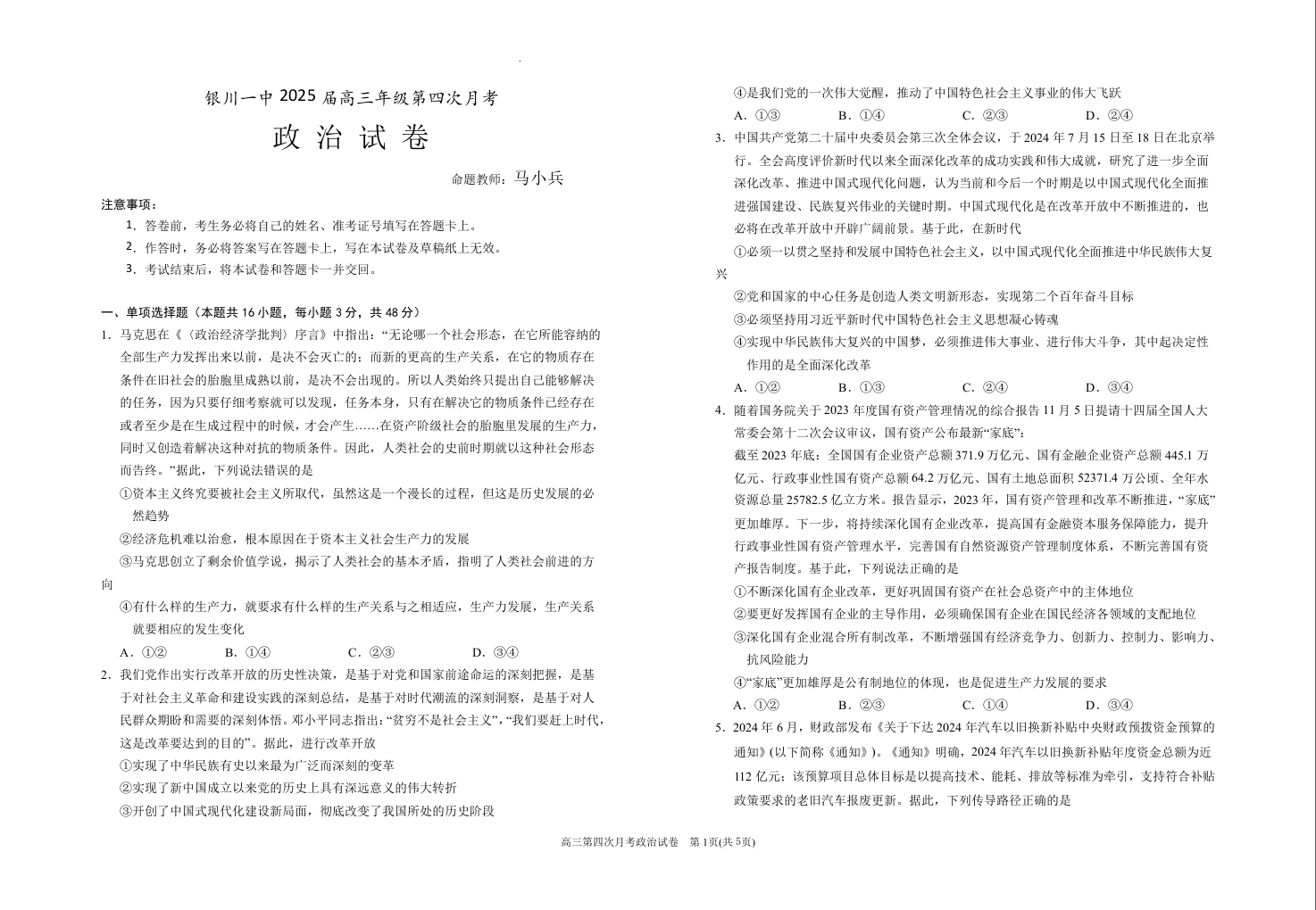 宁夏回族自治区银川一中2025届高三上学期第四次月考政治