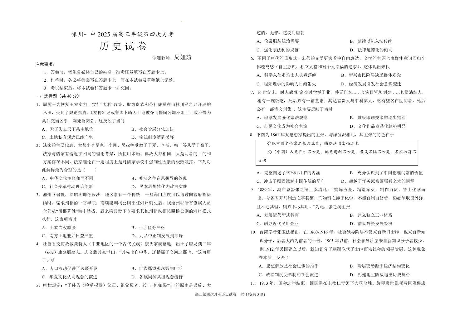 宁夏回族自治区银川一中2025届高三上学期第四次月考历史