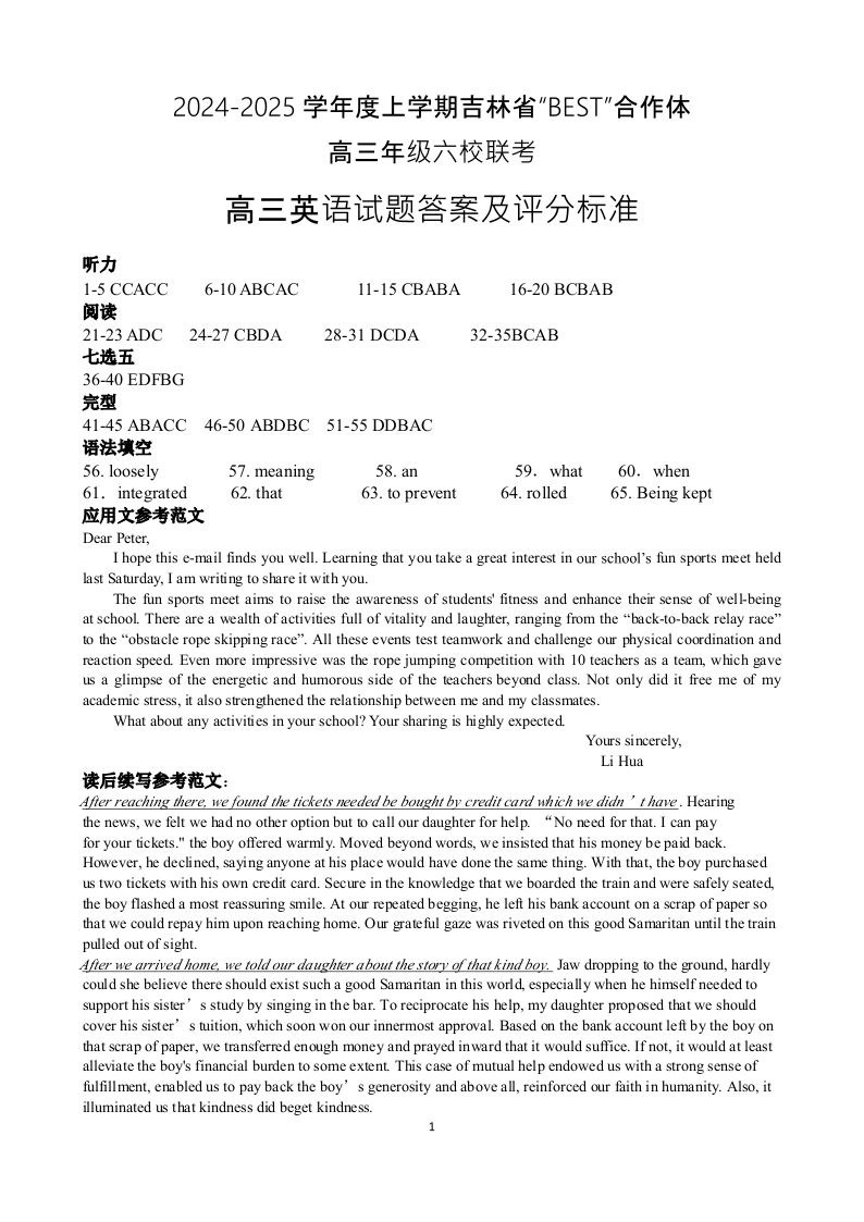 吉林省“BEST”合作体六校2025届高三上学期第三次联考英语答案