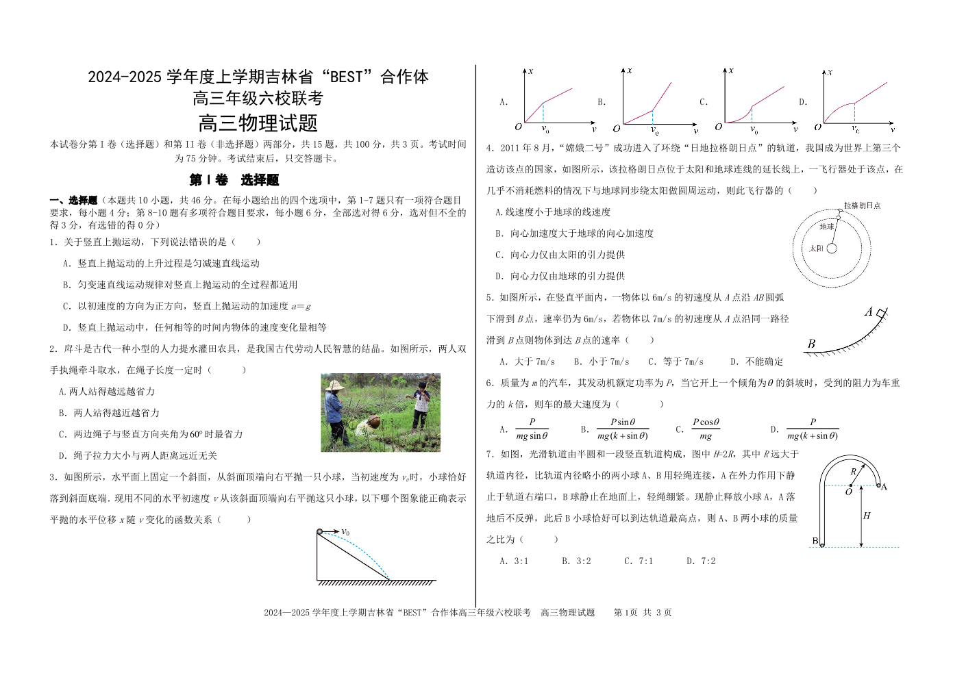 吉林省“BEST”合作体六校2025届高三上学期第三次联考物理