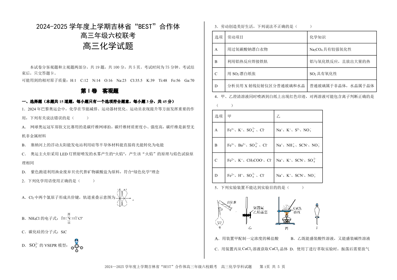 吉林省“BEST”合作体六校2025届高三上学期第三次联考化学