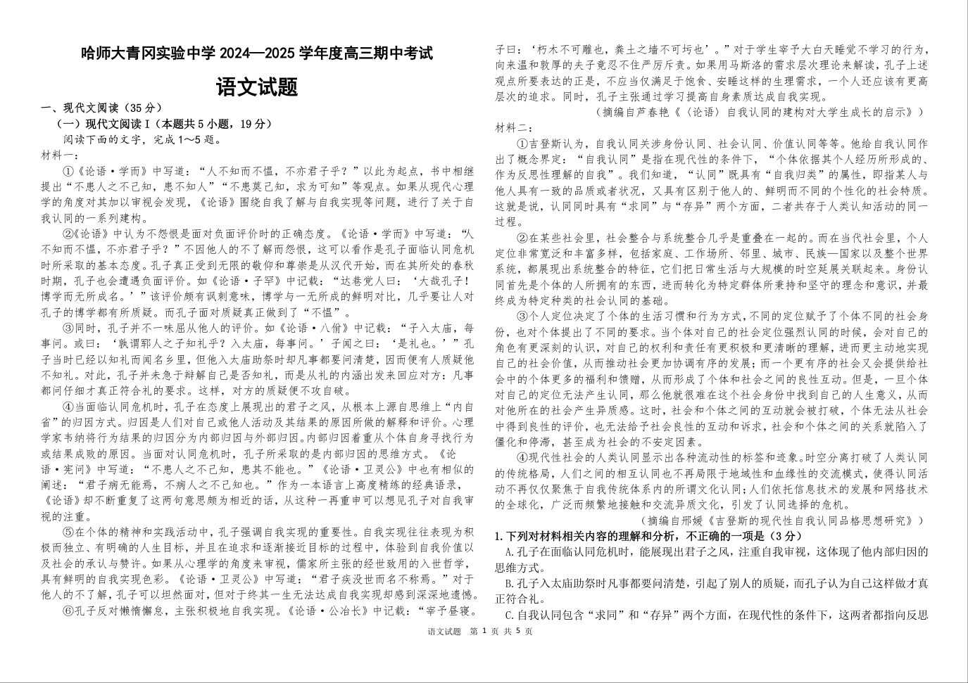 黑龙江省哈师大青冈实验中学2025届高三上学期期中考试语文