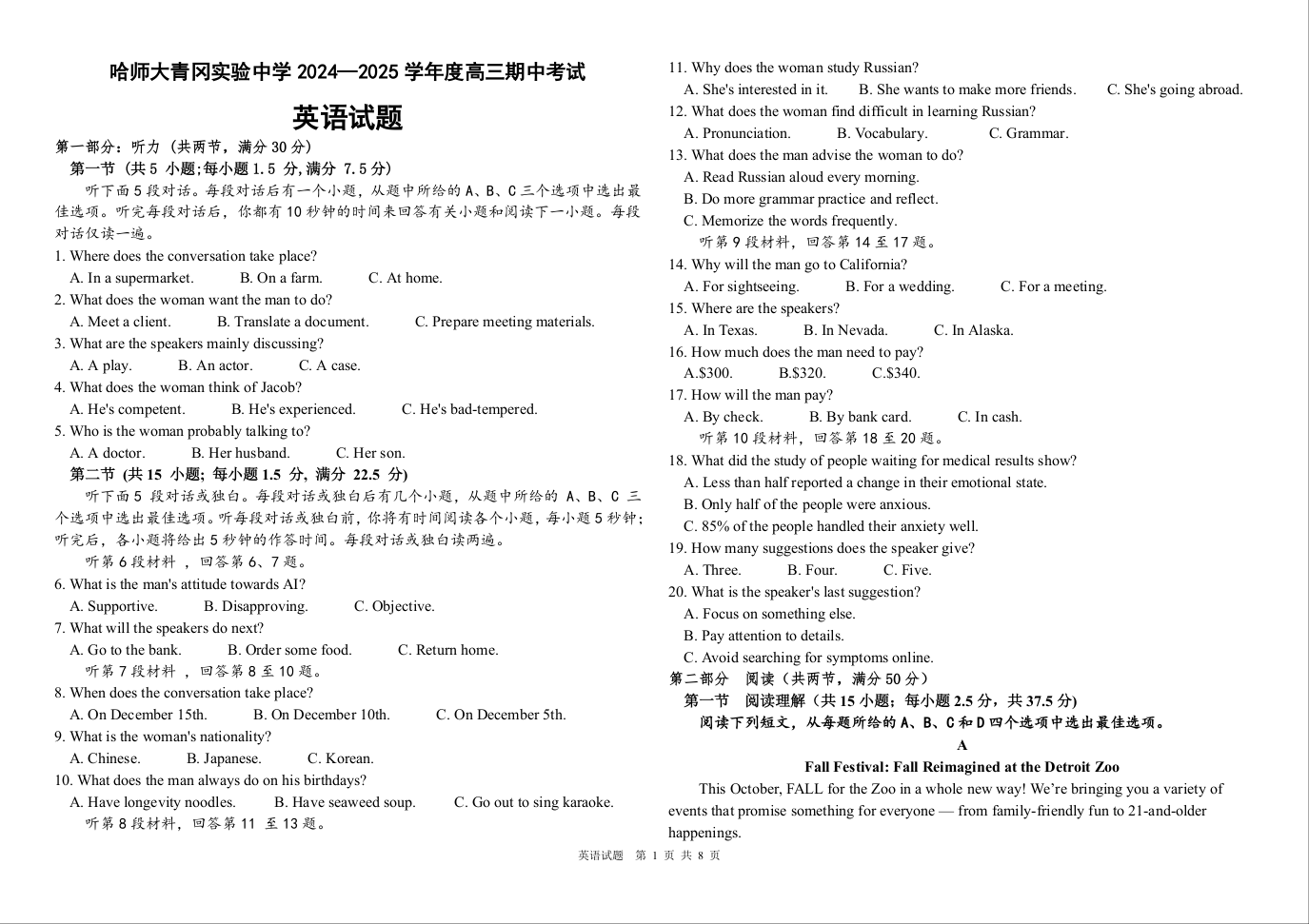 黑龙江省哈师大青冈实验中学2025届高三上学期期中考试英语+答案