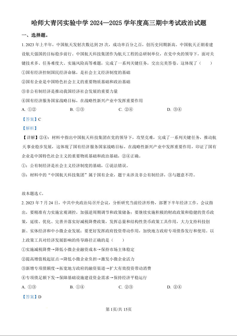 黑龙江省哈师大青冈实验中学2025届高三上学期期中考试政治(精品解析版)