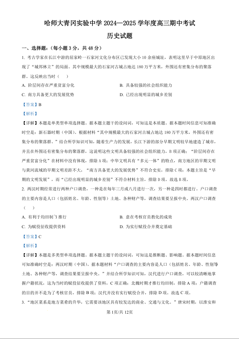 黑龙江省哈师大青冈实验中学2025届高三上学期期中考试历史(精品解析版)