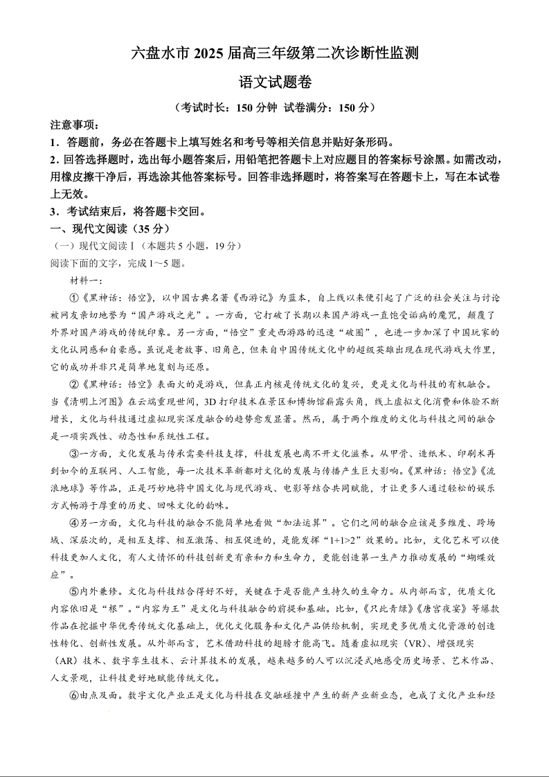 贵州省六盘水市2025届高三上学期第二次诊断性监测语文