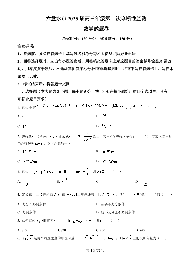 贵州省六盘水市2025届高三上学期第二次诊断性监测数学