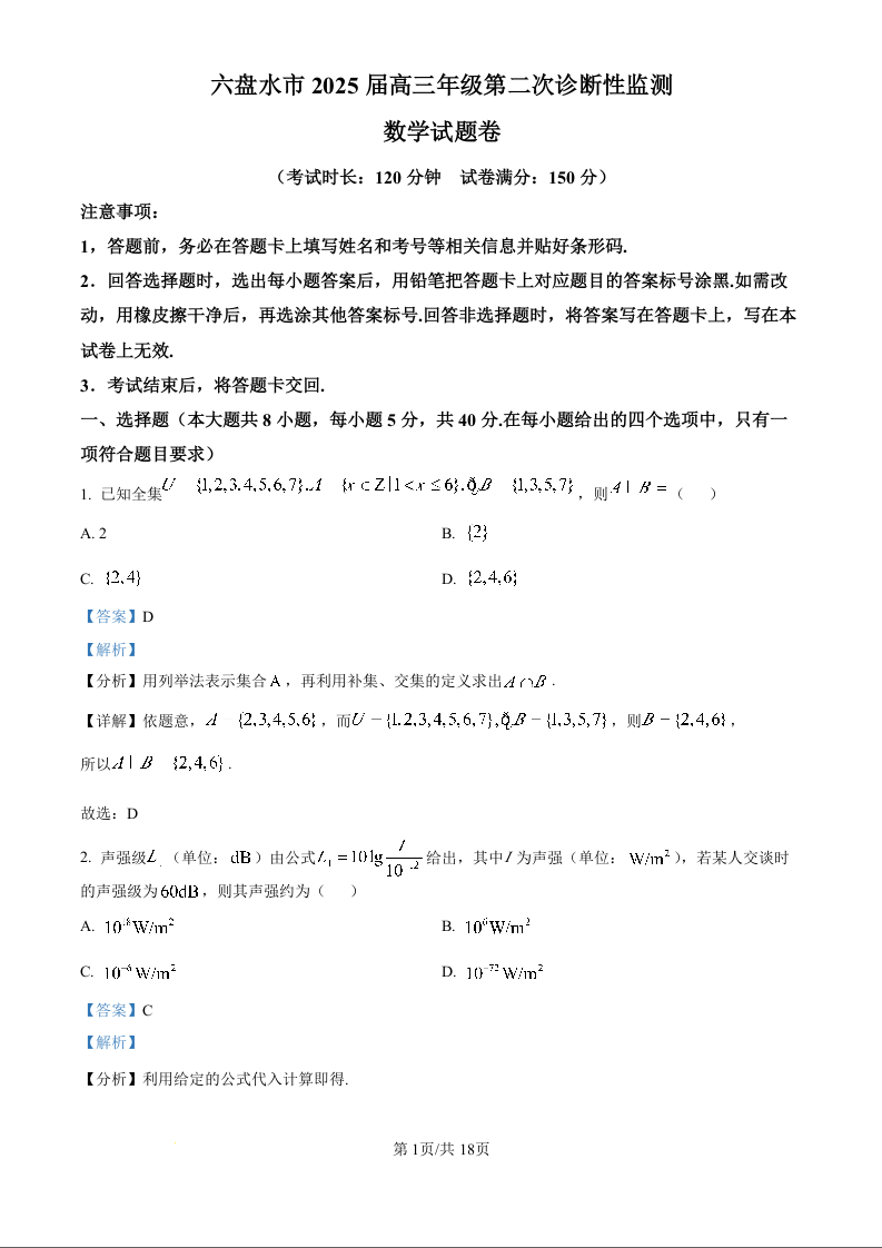 贵州省六盘水市2025届高三上学期第二次诊断性监测数学答案
