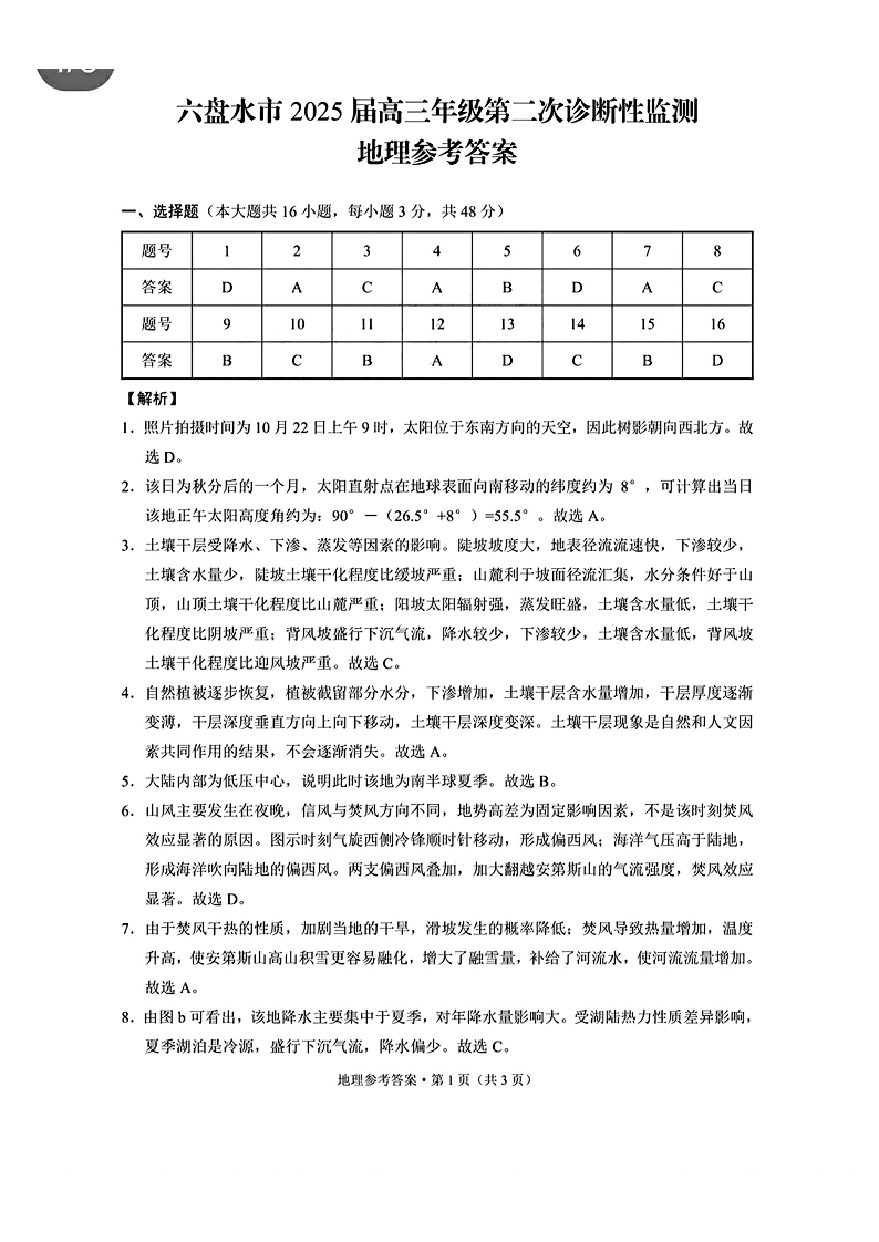 贵州省六盘水市2025届高三上学期第二次诊断性监测地理答案