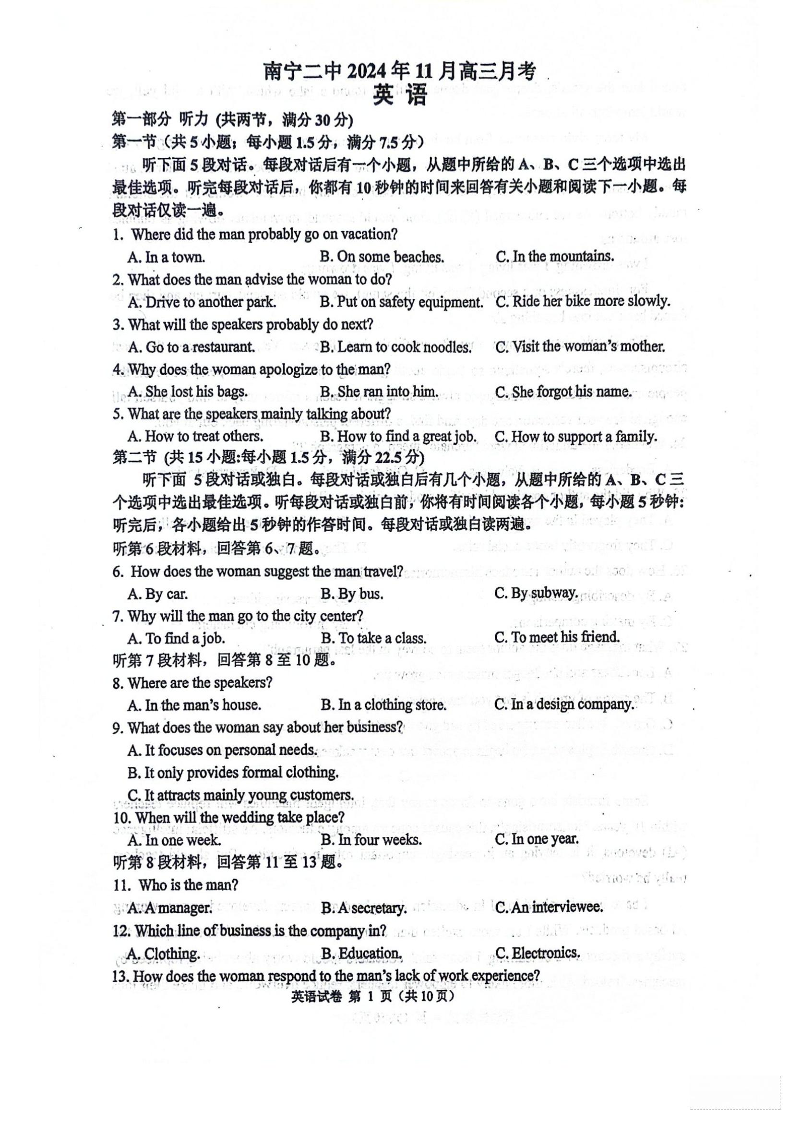 广西南宁市第二中学2025届高三上学期11月月考英语