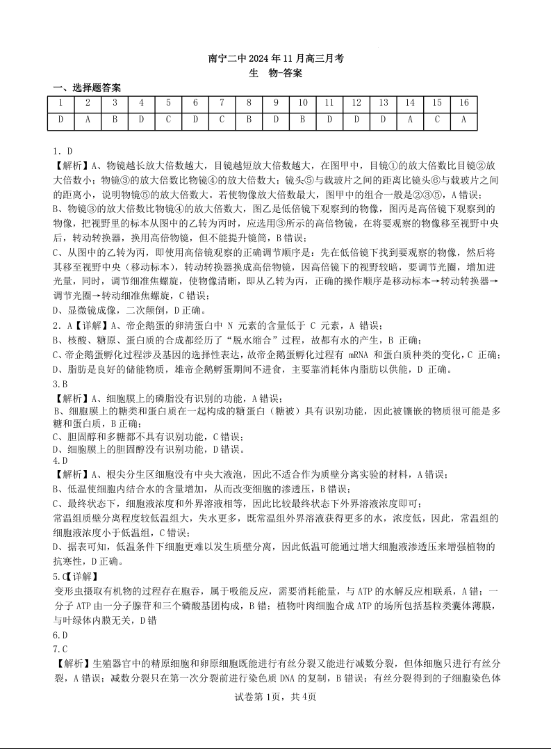 广西南宁市第二中学2025届高三上学期11月月考生物答案