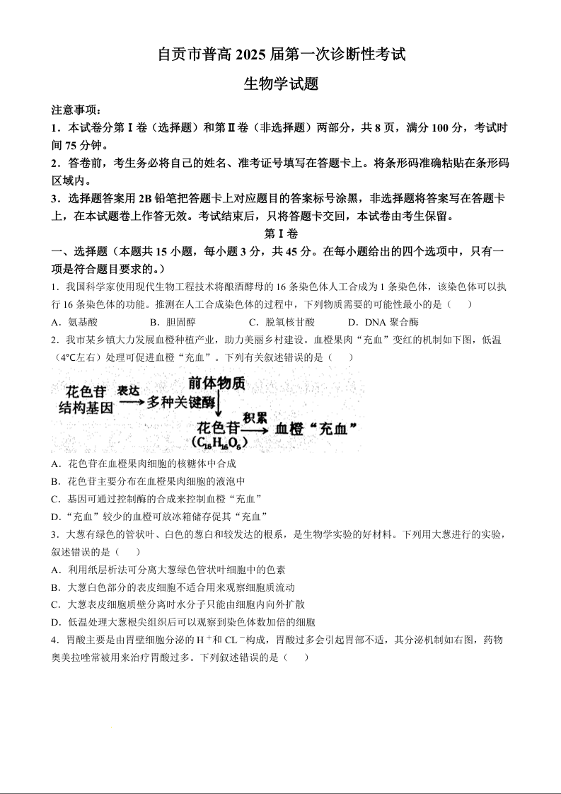四川省自贡市普高2025届第一次诊断性考试生物学+答案