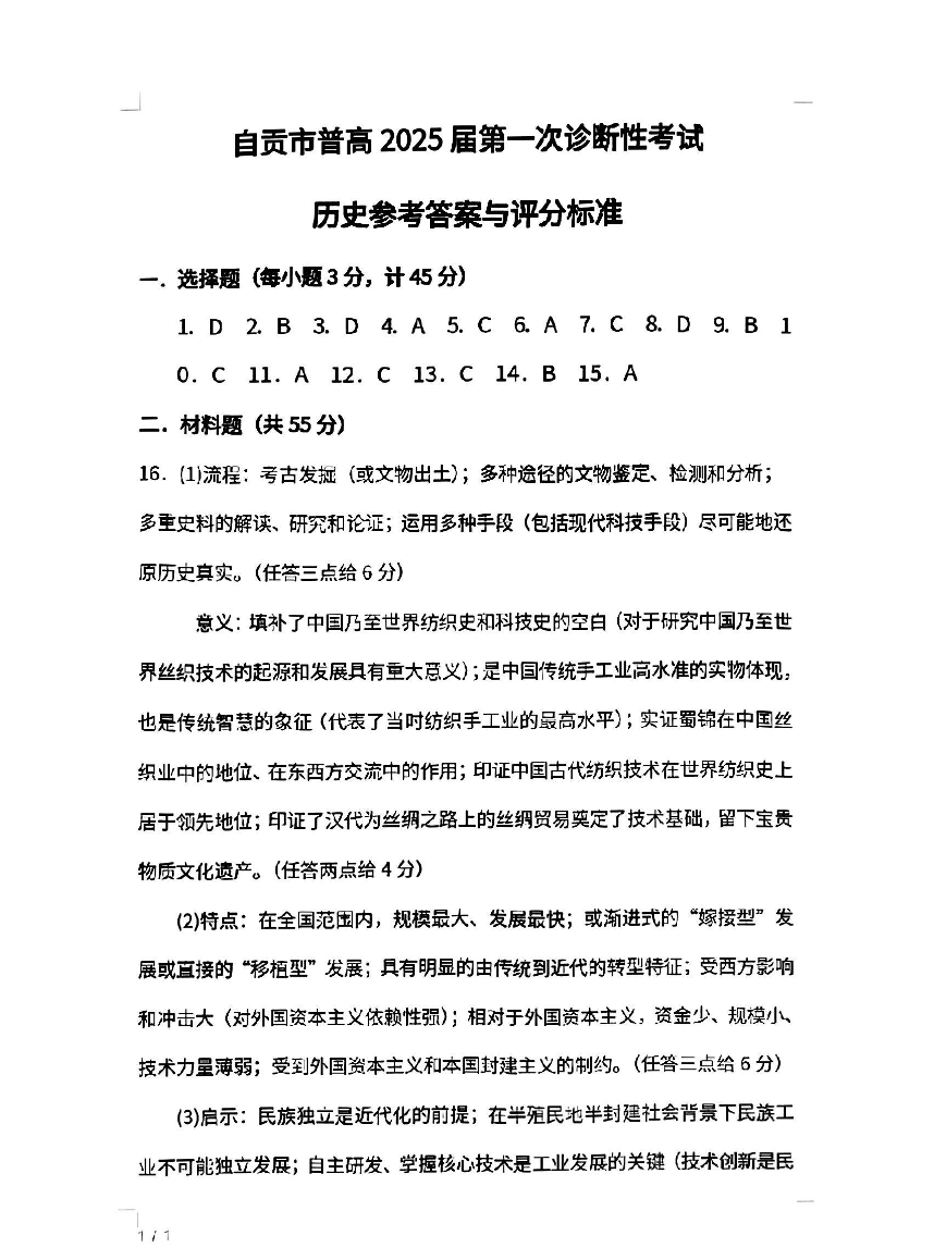 四川省自贡市普高2025届第一次诊断性考试历史答案