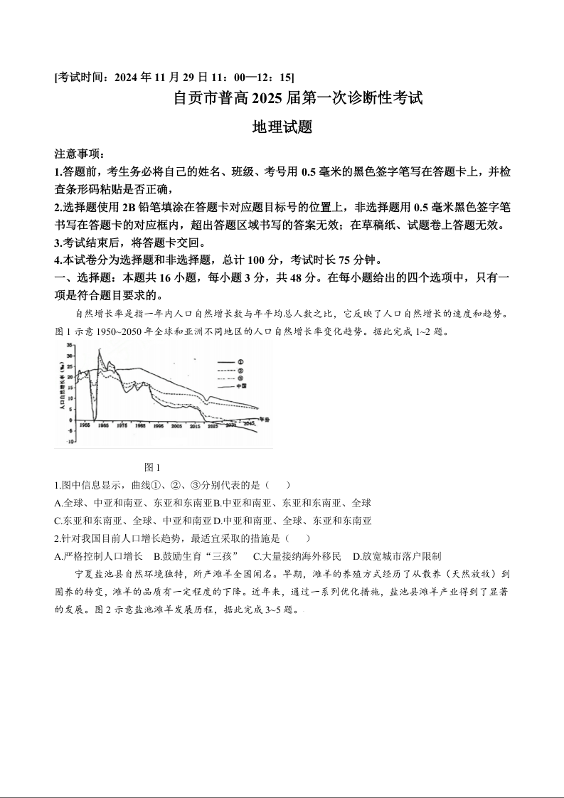 四川省自贡市普高2025届第一次诊断性考试地理+答案