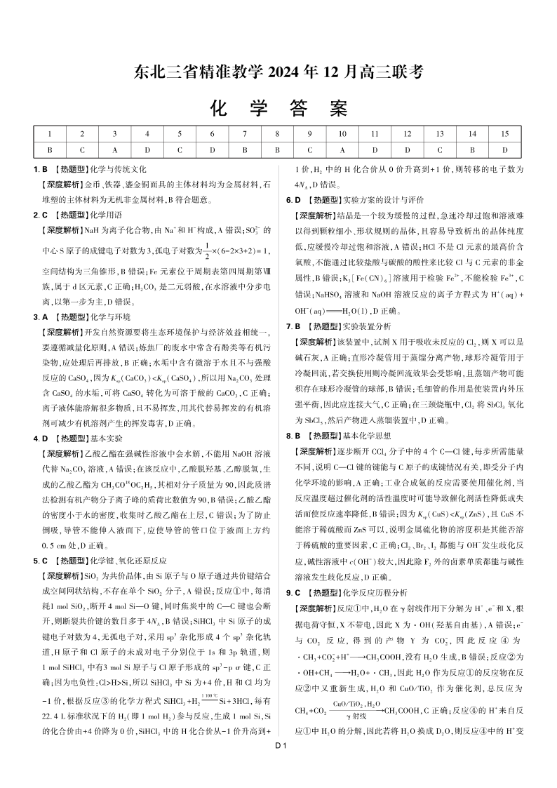东北三省精准教学2024年12月高三联考化学答案
