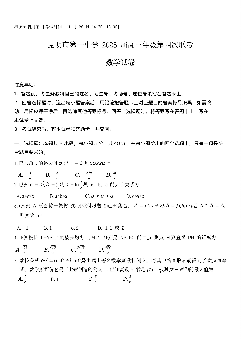 云南省昆明市第一中学2025届高三年级第四次联考数学