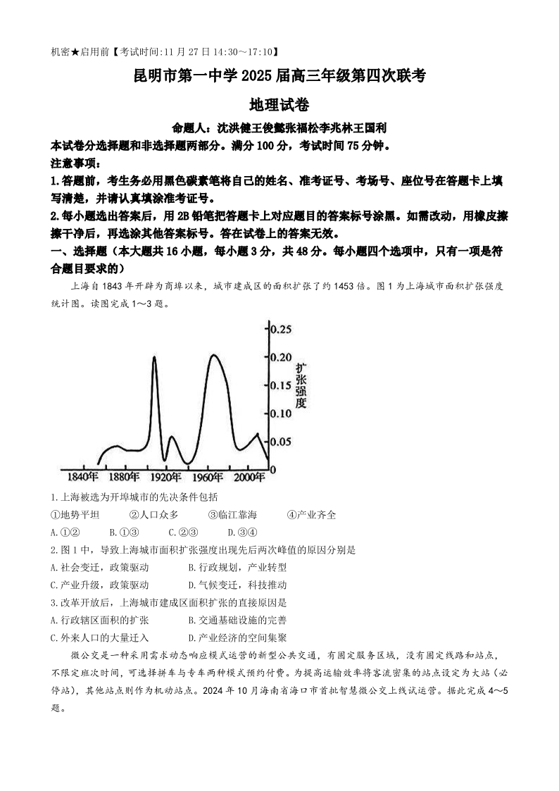 云南省昆明市第一中学2025届高三年级第四次联考地理+答案