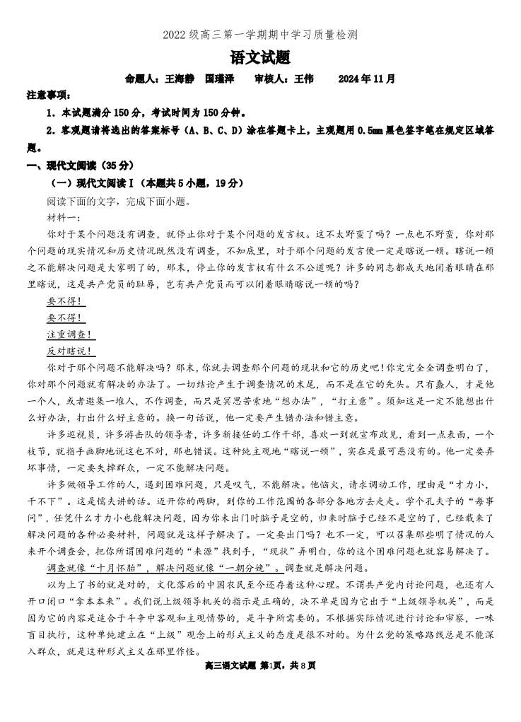 山东省淄博市临淄中学2025届高三上学期期中考试语文