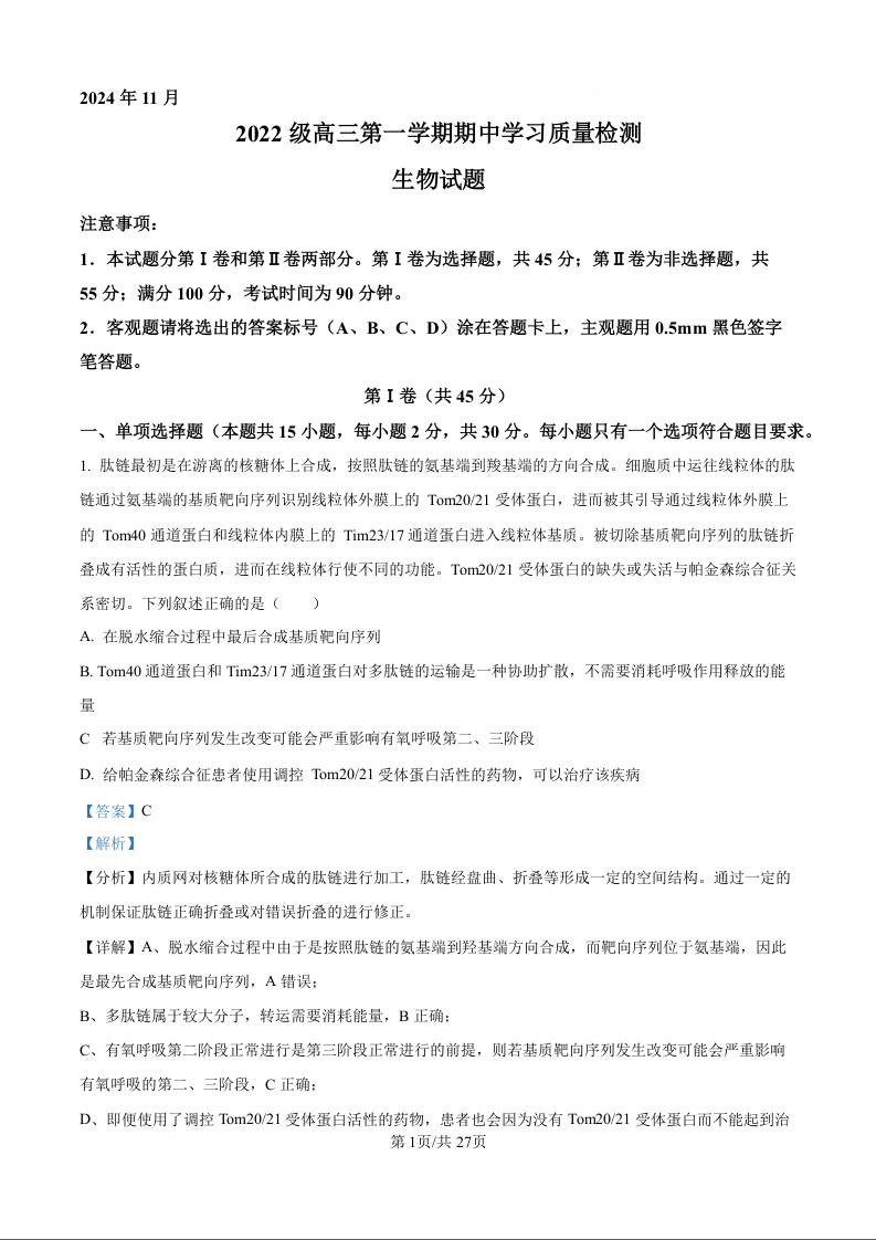 山东省淄博市临淄中学2025届高三上学期期中考试生物(精品解析版)