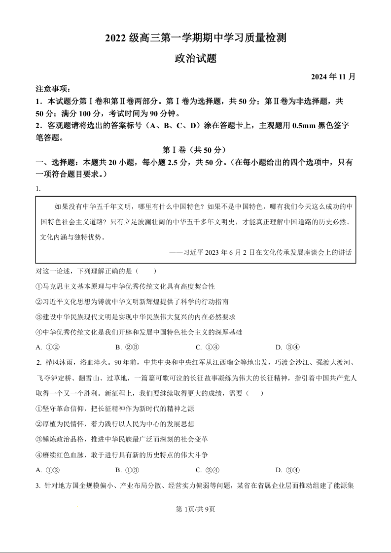 山东省淄博市临淄中学2025届高三上学期期中考试政治(原卷版)