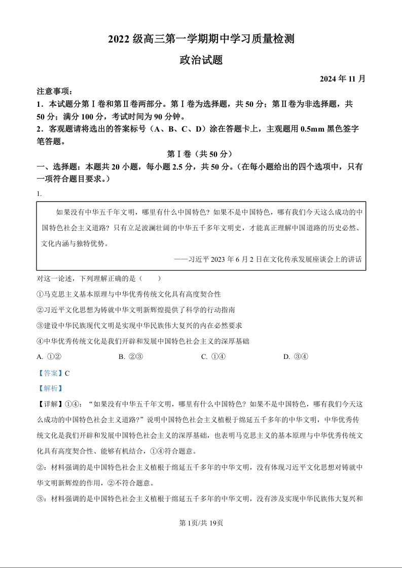 山东省淄博市临淄中学2025届高三上学期期中考试政治(精品解析版)