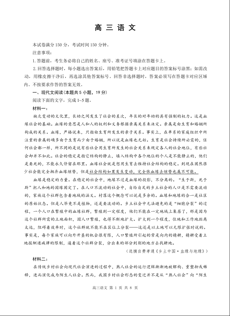 山东省威海市文登2025届高三上学期第一次模拟考试语文