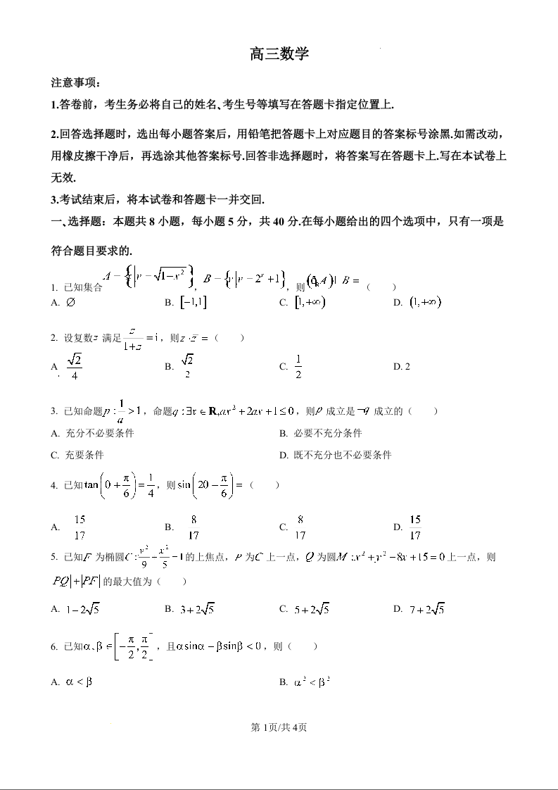 山东省威海市文登2025届高三上学期第一次模拟考试数学(原卷版)