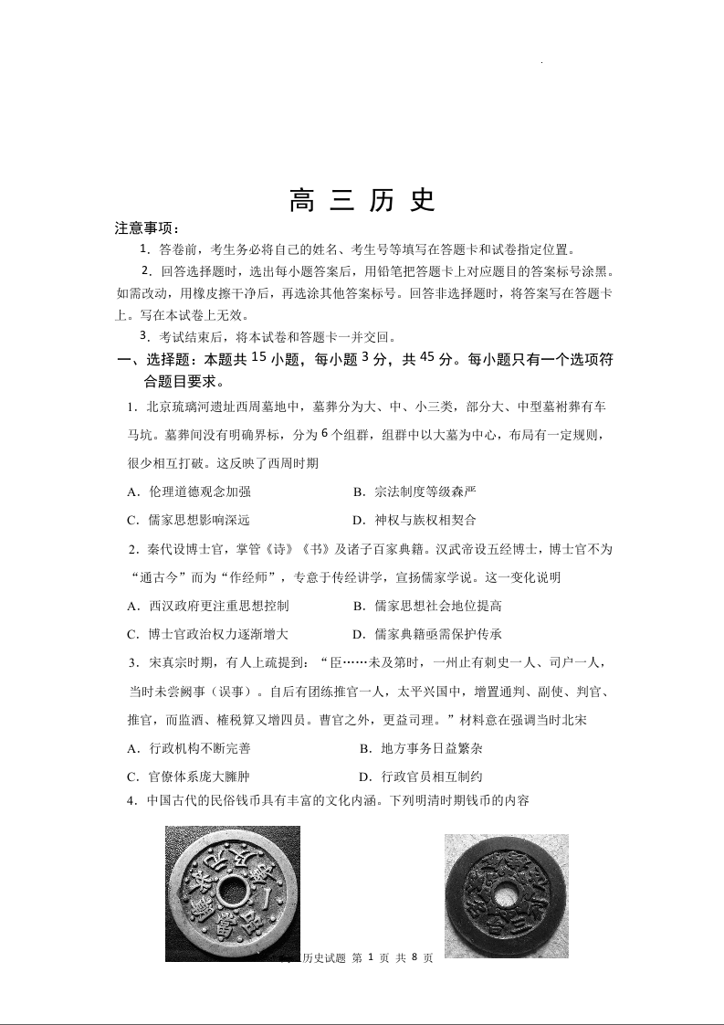 山东省威海市文登2025届高三上学期第一次模拟考试历史