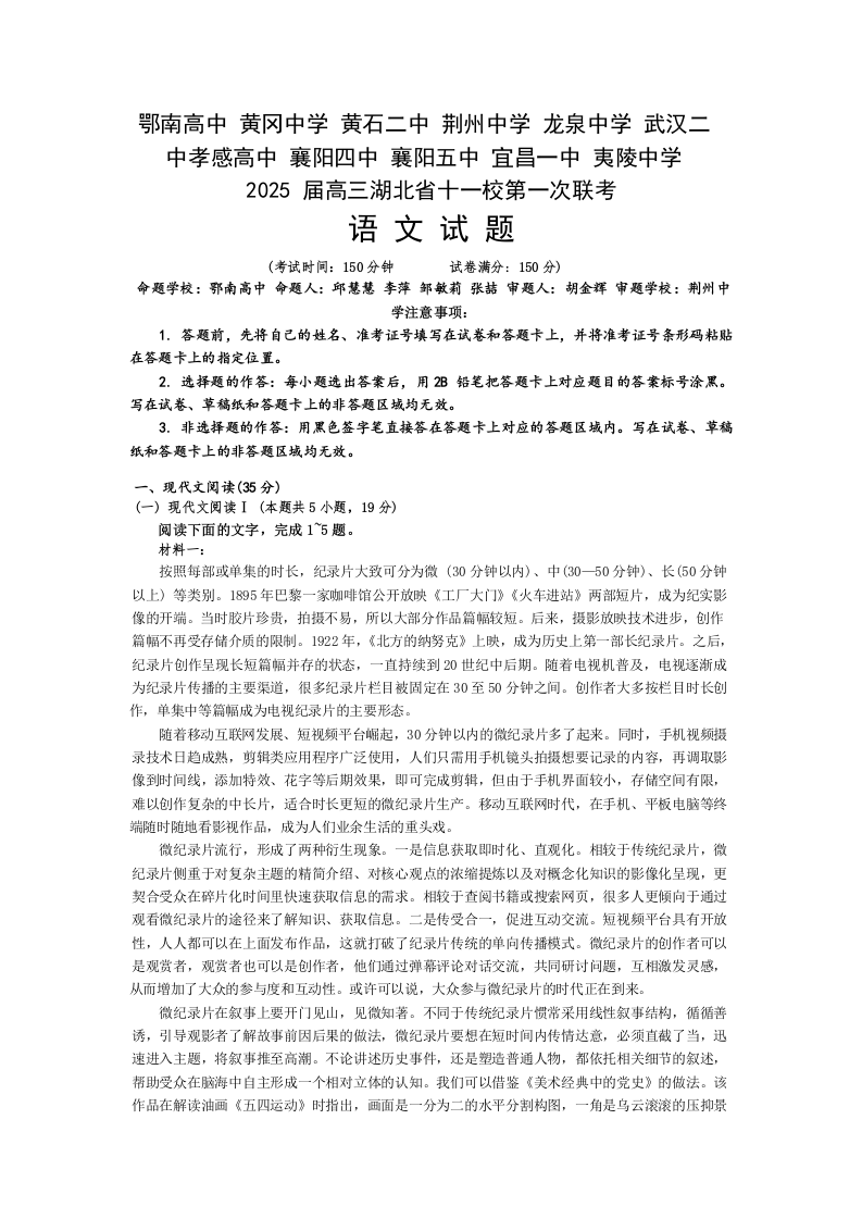 湖北省2025届高三十一校第一次联考语文语文+答案