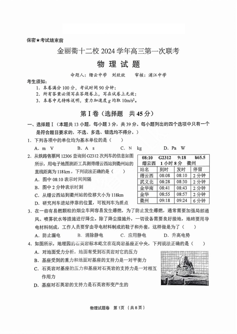 浙江省金丽衢十二校2025届高三第一次联考物理