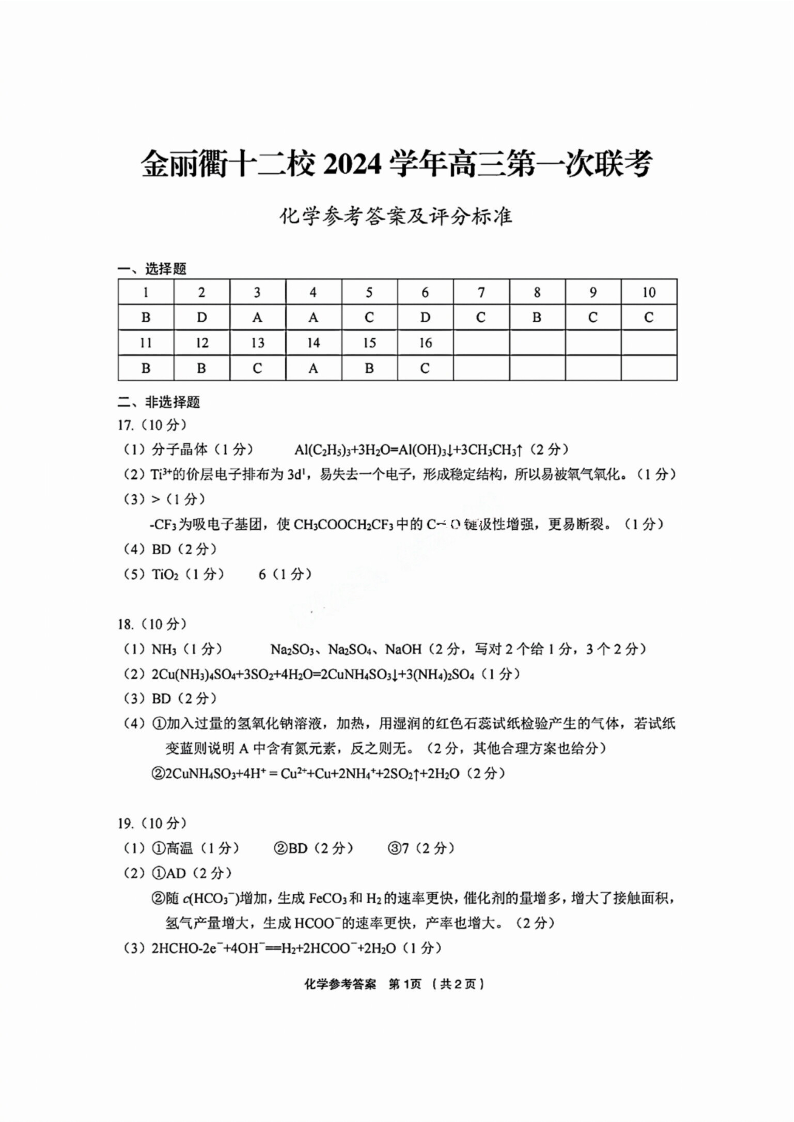 浙江省金丽衢十二校2025届高三第一次联考化学答案