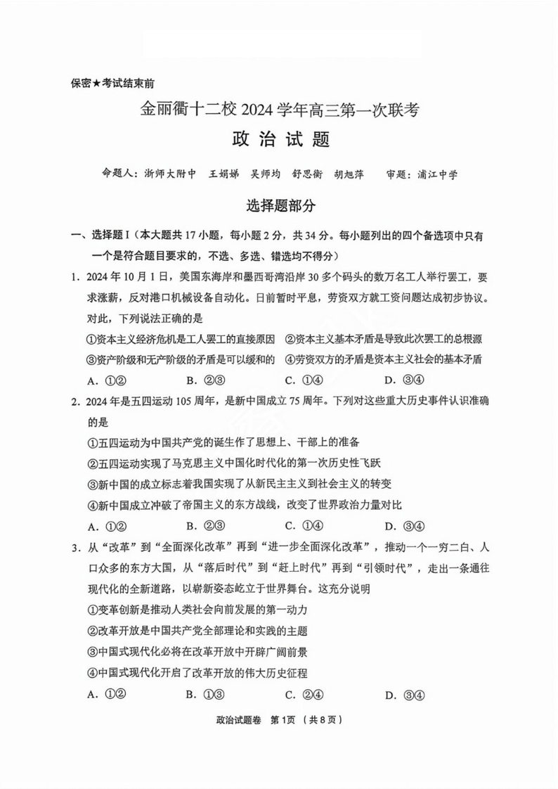 浙江省金丽衢十二校2025届高三第一次联考政治