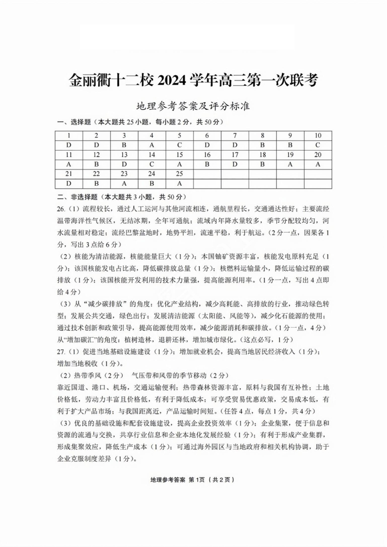 浙江省金丽衢十二校2025届高三第一次联考地理答案