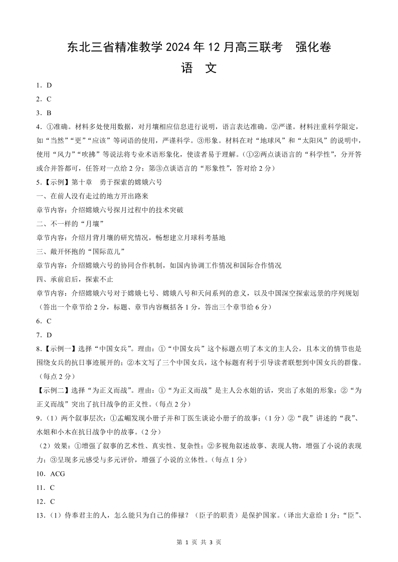 东北三省精准教学2024-2025学年高三上学期12月联考语文答案