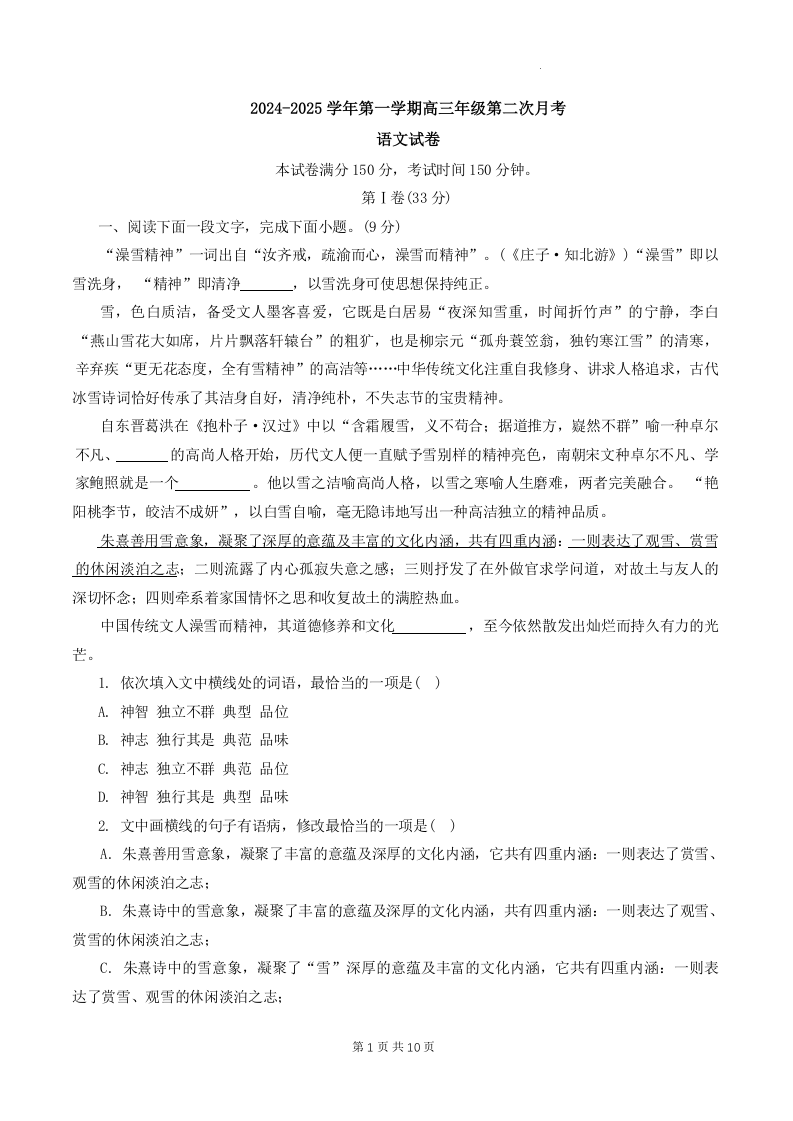 天津市第二十五中学2025届高三上学期第二次月考语文