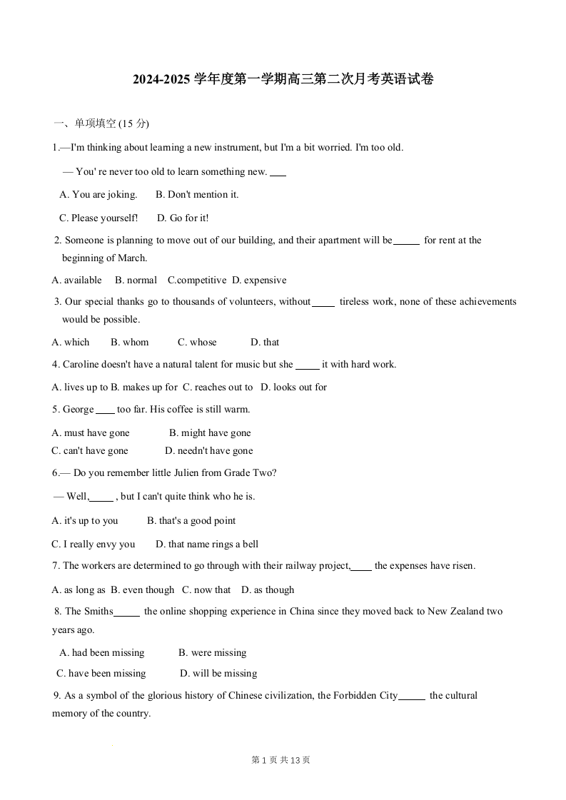 天津市第二十五中学2025届高三上学期第二次月考英语