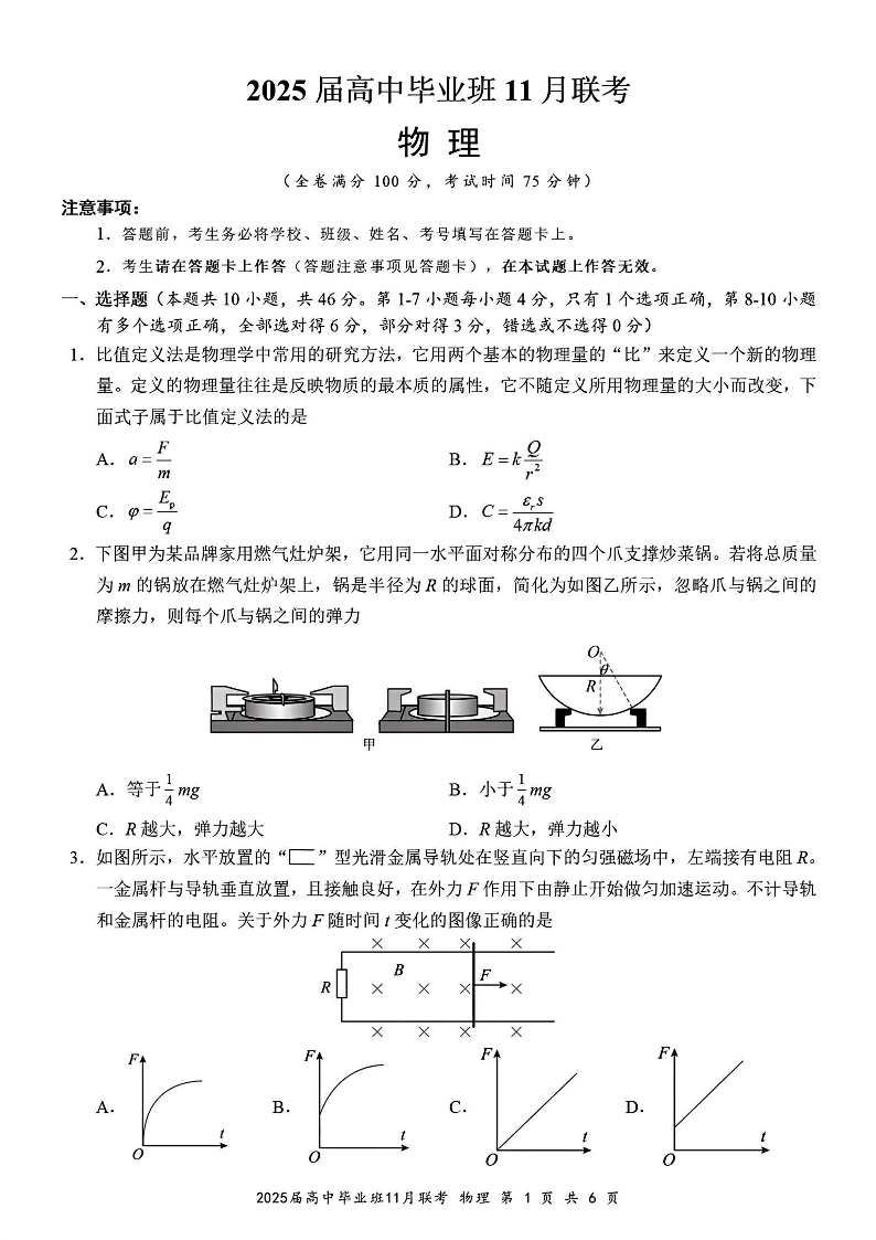 广西省新课程教研联盟2025届高三毕业班11月联考物理+答案