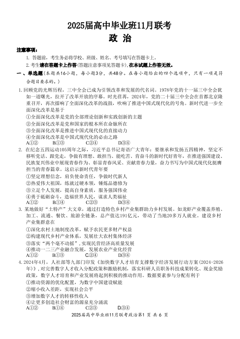 广西省新课程教研联盟2025届高三毕业班11月联考政治