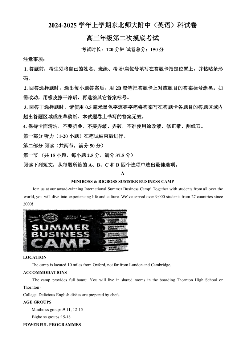 吉林省东北师大学附中2025届高三年级上学期第二次摸底考试英语(原卷版)