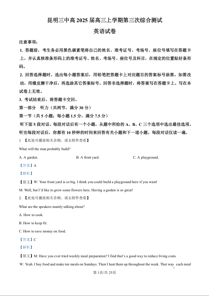 云南省昆明市第三中学2024-2025学年高三上学期11月月考英语+听力原文(精品解析版)